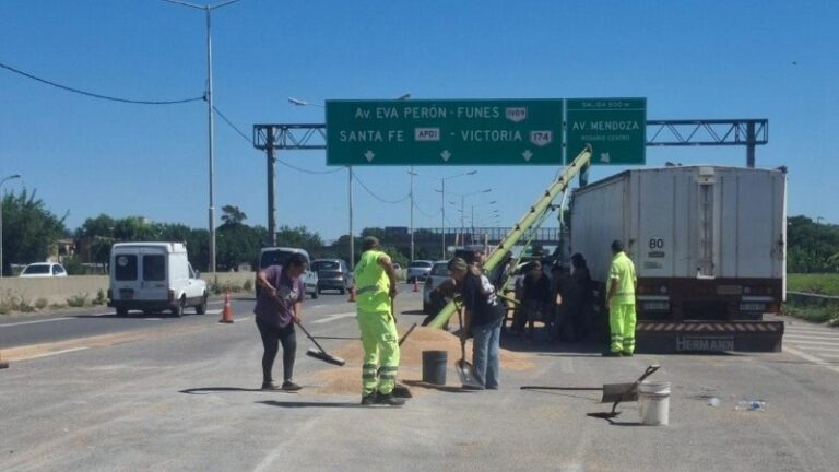 Un camión que transportaba cereal sufrió un vuelco este sábado por la mañana en la avenida Circunvalación, a la altura de Pellegrini, generando un importante trastorno en el tráfico de la zona. La circulación se vio afectada en la mano que va hacia el norte, con largas demoras y solo un carril disponible.