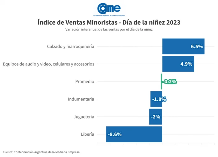 Las ventas minoristas pymes por el Día de la Niñez cayeron 0,2% frente a la misma fecha del año pasado, medidas a precios reales, de acuerdo al relevamiento de la Confederación Argentina de la Mediana Empresa (CAME).