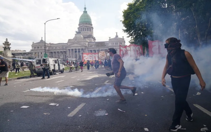 Mientras tanto, un grupo de manifestantes que se concentraban sobre la avenida Rivadavia, comenzó a arrojar piedras, botellas y todo tipo de objetos contundentes contra efectivos de Gendarmería y la Policía Federal que se encontraban detrás del vallado ubicado sobre la avenida Entre Ríos.