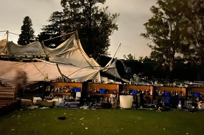 "Se calló la estructura del aniversario de 100 años del club mitre en Pérez, yo estaba ahí fue un desastre, gente corriendo y gritando, todos en shock, la carpa se voló y calló sobre las mesas, por suerte no hubo fallecidos pero si muchos heridos"#AlertaNaranja pic.twitter.com/db8ECHbEYf