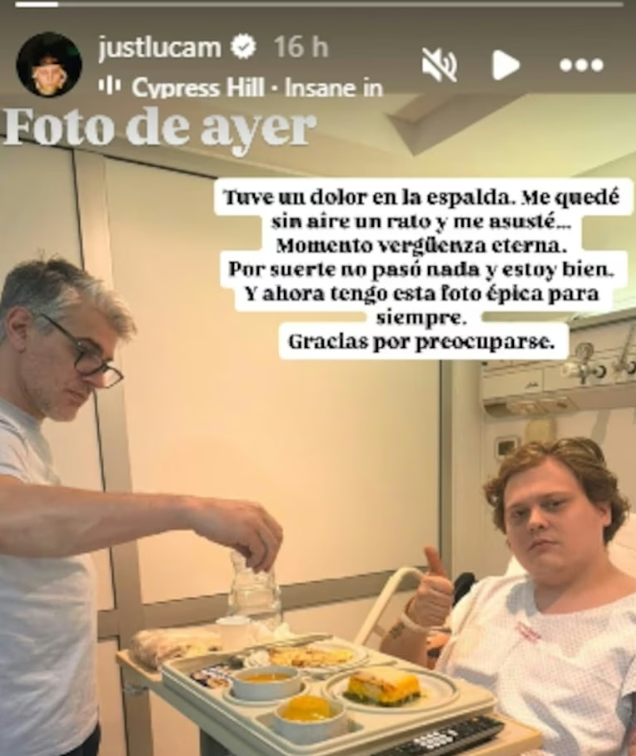 La imagen muestra a Luca recostado en la cama del hospital, acompañado por su padrastro, Pablo Echarri, y levantando el pulgar en señal de que todo está bajo control. Luca agradeció el cariño y la preocupación de sus seguidores, cerrando su mensaje con: “Gracias a todos por preocuparse”.