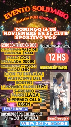 Realizarán un evento solidario el 16 de noviembre en el Club Sportivo de Villa Gobernador Gálvez con sorteos, buffet y música en vivo.