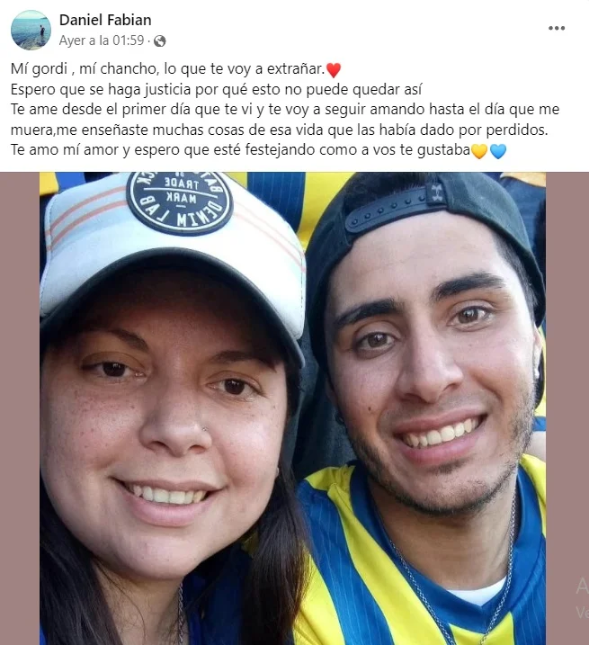 En su cuenta de Facebook, Daniel, quien fue testigo del asesinato de su novia, escribió en sus redes “Mí gordi, mi chancho, lo que te voy a extrañar. Espero que se haga justicia porque esto no puede quedar así”.