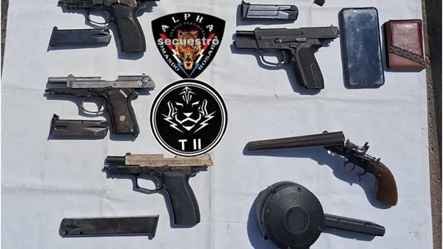 Tras la aprehensión, el Comando Radioeléctrico procedió a la inspección de la Gilera que manejaba. Allí se encontró una mochila con cuatro pistolas 9mm, un pistolón calibre 36 y varios cargadores.