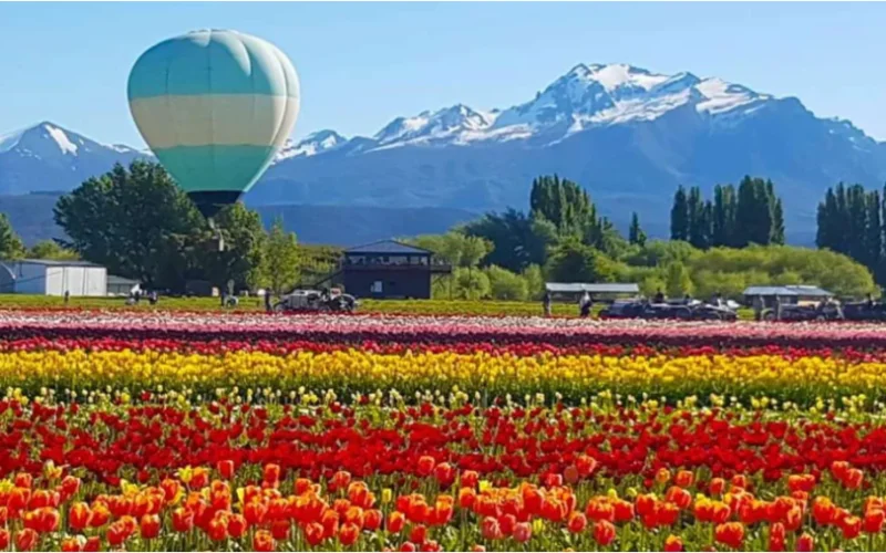 En la Patagonia hay un campo de tulipanes que está ubicado en una pequeña aldea galesa de 10 mil habitantes. Y desde ahora se pueden realizar vuelos en globo aerostático. Este campo está ubicado en Trevelin, Chubut. Allí florecen 2.3 millones de bulbos de tulipanes de 27 colores distintos, lo que genera un paisaje espectacular y colorido para los turistas.