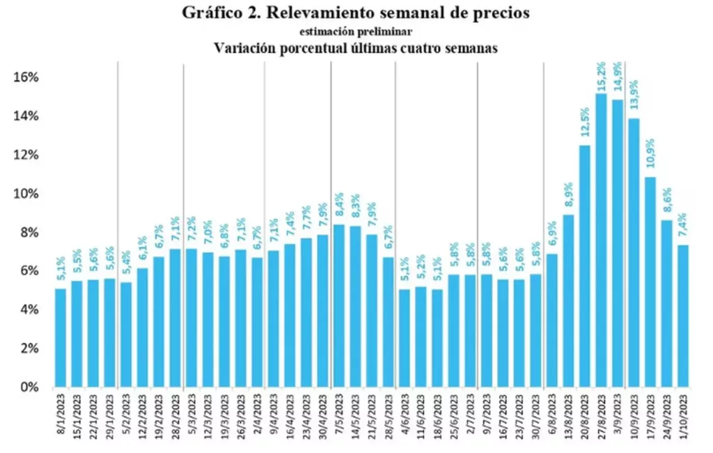 El Gobierno argentino anunció que el índice de inflación semanal fue del 1.3% entre el 25 de septiembre y el 1 de octubre, lo que indica una disminución en la tasa de inflación.
