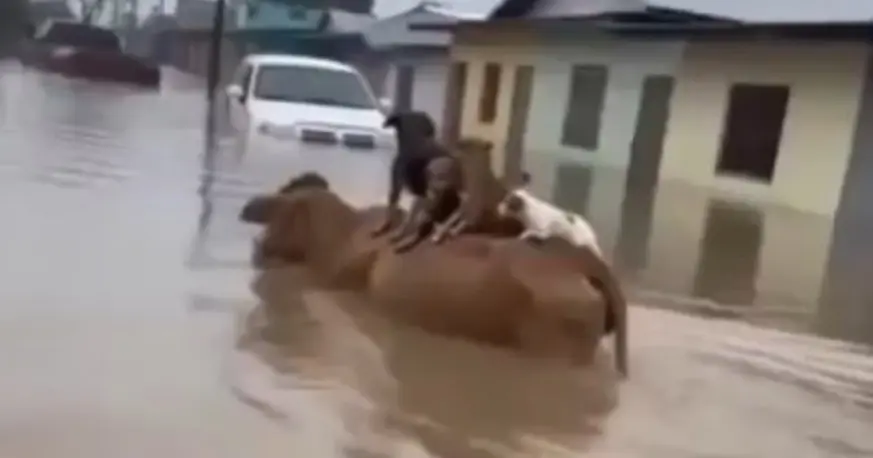 En las imágenes se observa a los animales en evidente situación de riesgo, rodeados de corrientes y barro. Frente a ese escenario, la vaca avanza con paso firme mientras los perros se acomodan sobre su espalda, aprovechando su altura para no quedar sumergidos. La escena fue interpretada por muchos usuarios como un ejemplo de solidaridad entre especies.