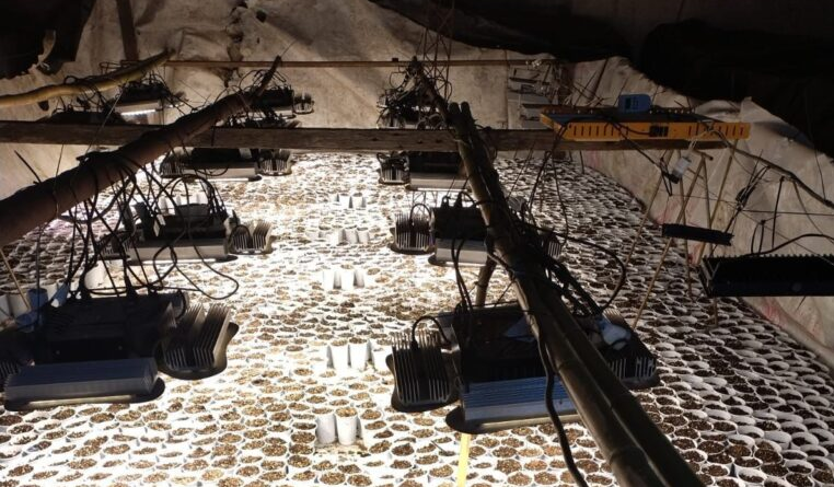 Durante el rastrillaje, la policía encontró rastros de un cuarto implicado y llegó a un galpón cercano. Allí se descubrió un invernadero con casi 3.000 plantines de cannabis, frascos con marihuana, más de 100 gramos de semillas, 32 reflectores y diversos elementos vinculados a la investigación.